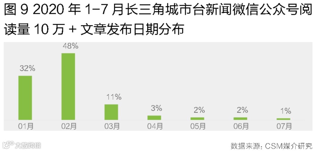 相比短视频内容的综合性,微信公众号更具有新闻资讯属性,强调信息发布的迅速和权威。2020年1-7月,单篇阅读量在10万以上的文章,主要以疫情相关的信息为主,且集中出现在1-2月疫情爆发初期。从10万+文章数量分布可见,1-2月的高阅读量文章即占1-7月所有高阅读量文章的八成(图9)。