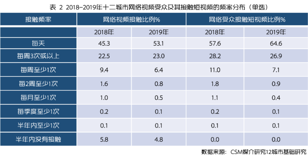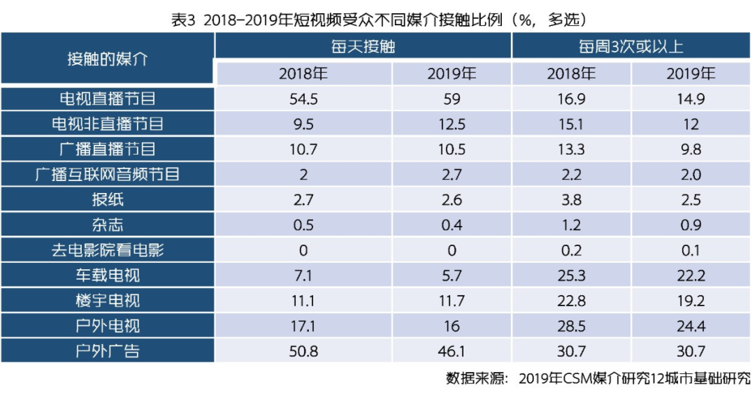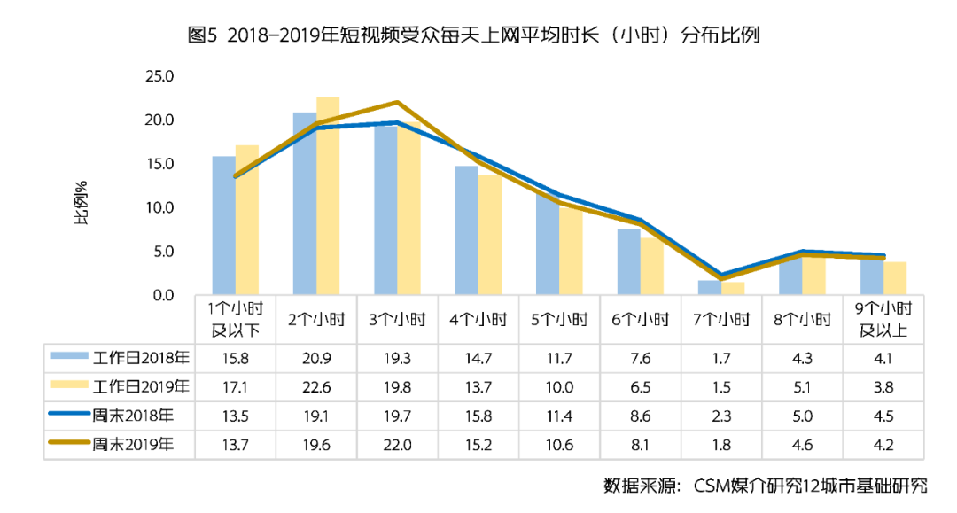 2019年全国电视人口人均收看电视的时长是124分钟(CSM104个调查城市组),即2小时4分钟;12城市短视频受众上网的时长与之相近,平均每天上网时长在2至3个小时的比例最高,即2、3集电视剧,或者看一部大片的时长。