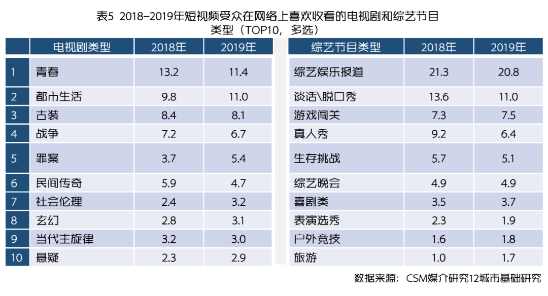 在节目类型的收视偏好上,短视频用户对综艺/娱乐类、电视剧和新闻/时事类三类节目的选择占据前三位,尤其是对综艺/娱乐类节目的偏好更强,但与2018年相比,今年的比例略有下滑,电视剧占比有所上升。
