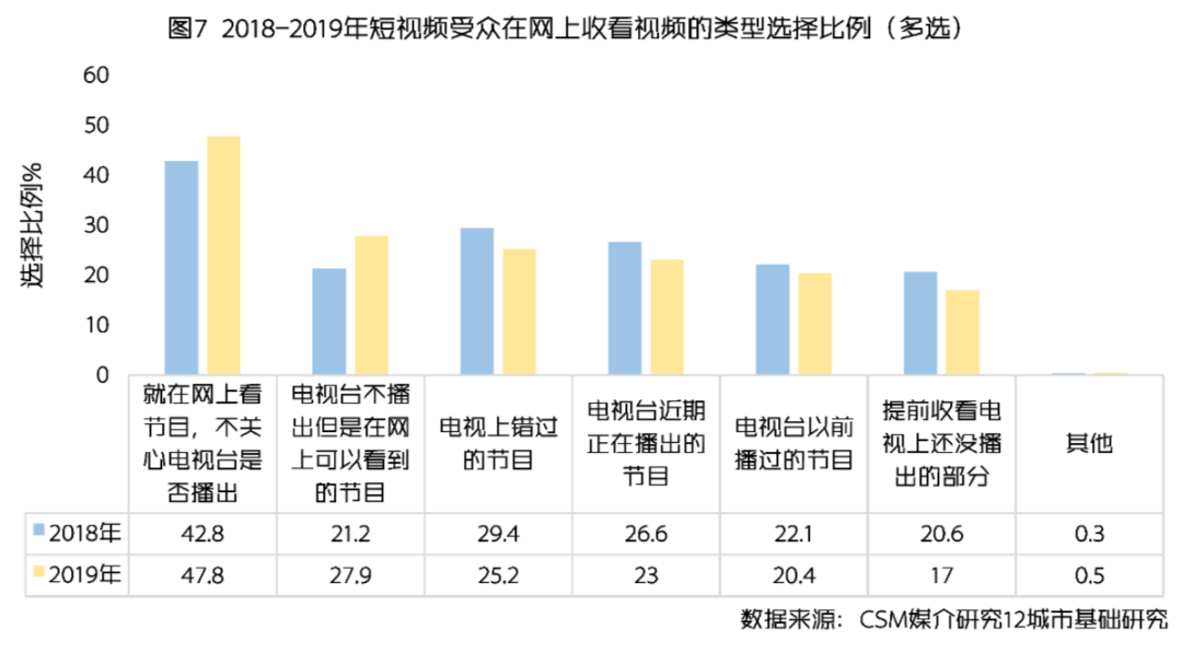近年来,随着网络视频的发展,越来越多的节目选择先网后台甚至是网络独播,相比电视节目,网上的资源更为丰富,短视频受众在网上收看的视频内容中,近一半的短视频受众“就在网上看节目,不关心电视台是否播出”,该比例高达47.8%,比2018年高出5个百分点。