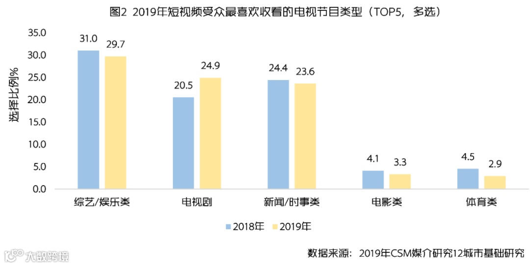 2、综艺/娱乐类节目是短视频受众最喜欢收看的电视节目类型,电视剧占比提升