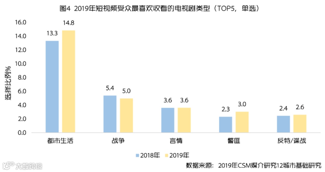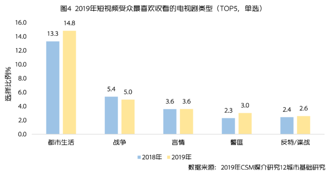 细分电视剧类型,短视频受众最喜欢收看的是都市生活题材,其次是战争剧以及言情剧,都市生活题材和警匪题材的电视剧份额高于2018年(图2-4)。