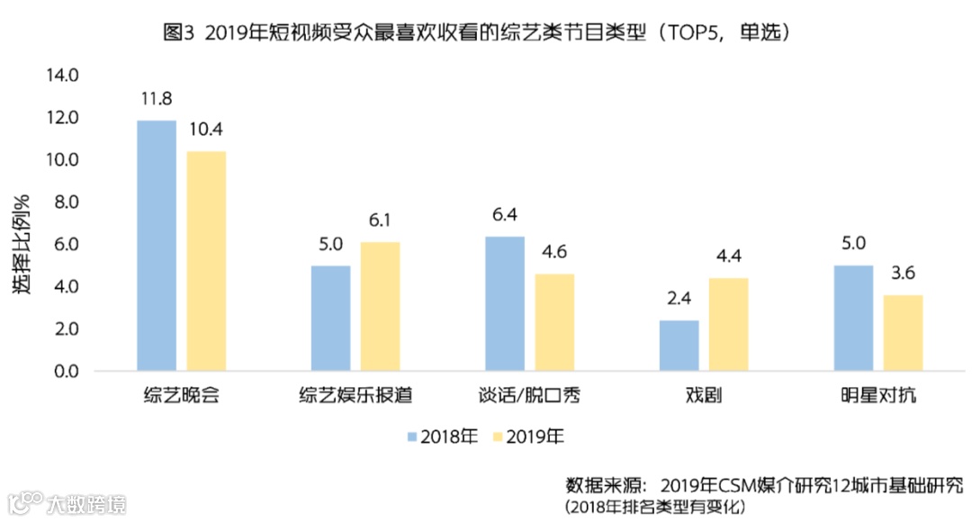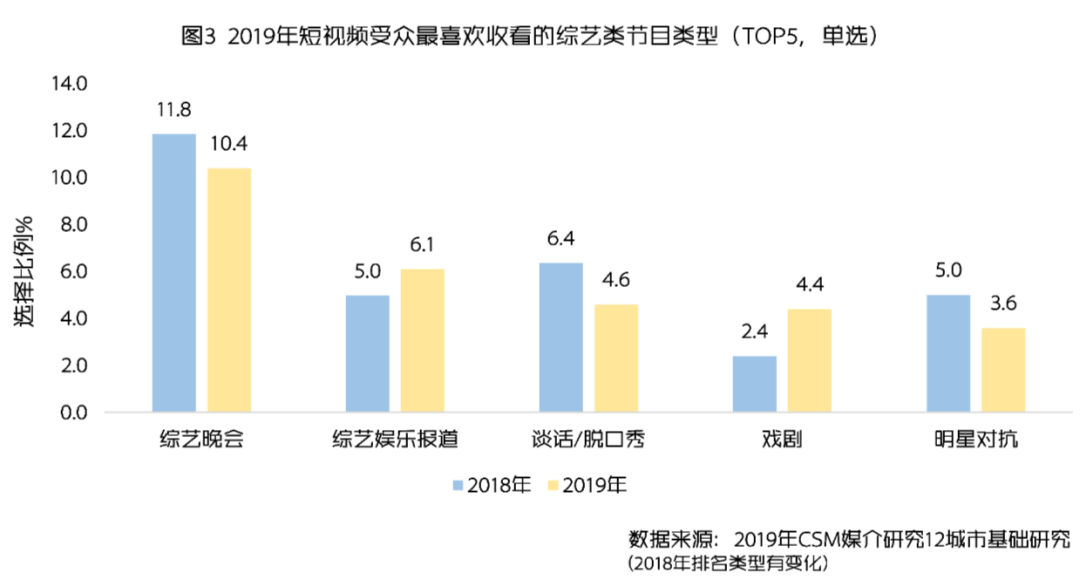 对于喜爱综艺类节目的受众,他们所偏爱的综艺类型表现多样而丰富,其中综艺晚会仍然是最受欢迎的细分类型,谈话/脱口秀和综艺娱乐报道也颇受短视频用户的喜爱,与2018年相比,综艺晚会、谈话/脱口秀和明星对抗类节目份额下降,综艺娱乐报道和戏剧类节目份额上升。