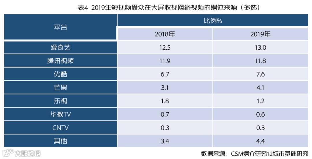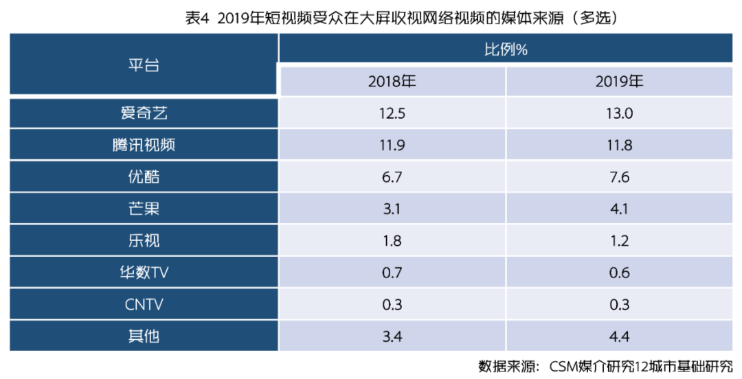 爱奇艺和腾讯视频是短视频受众在大屏收看网络视频最常选择的媒体来源,比例均达到10%以上,优酷占比为7.6%,位居第三。2019年爱奇艺、优酷、芒果的占比均有上升(表4)。