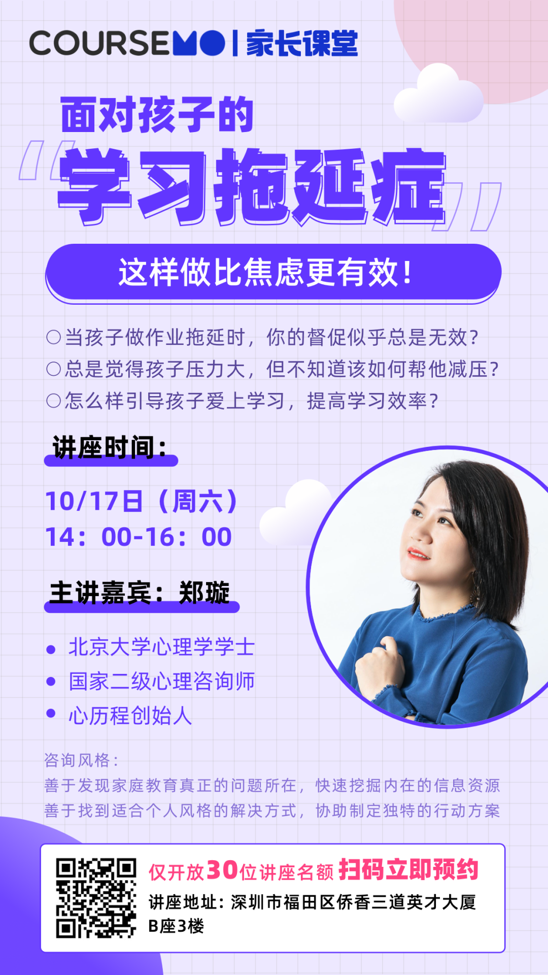 为了帮助各位家长们缓解孩子教育中的焦虑问题,COURSEMO推出了线下家长课堂,旨在帮助家长们缓解或减轻“焦虑杂症”,做“焦虑”的主人!