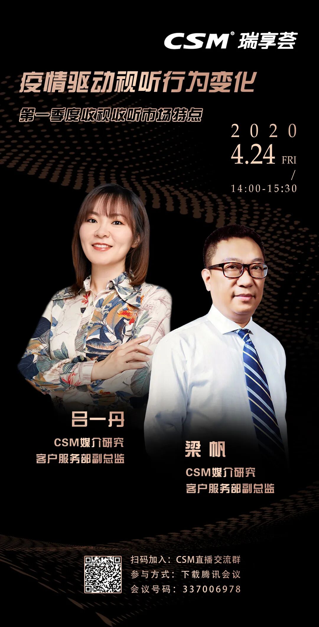 2020年第一季度,在举国齐心抗击疫情的战役中走过。疫情大考,对于传统广电,是冲击?挑战?还是进一步融合发展的机遇与风口?中国广视索福瑞媒介研究(CSM)特开辟直播通道,邀请客户服务部副总监:吕一丹、梁帆,与业内人士共同回顾与探讨疫情影响下的第一季度视听行为变化。2020年4月24日(明日)下午14:00,相约CSM瑞享荟,不见不散!