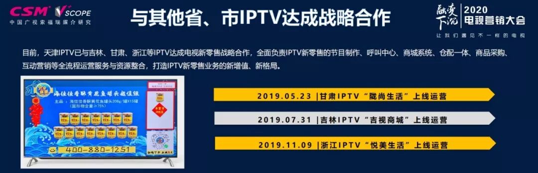 目前,天津IPTV已与吉林、甘肃、浙江等IPTV达成电视新零售战略合作,全面负责IPTV新零售的节目制作、呼叫中心、商城系统、仓配一体、商品采购、互动营销等全流程运营服务与资源整合,打造IPTV新零售业务的新增值、新格局。
