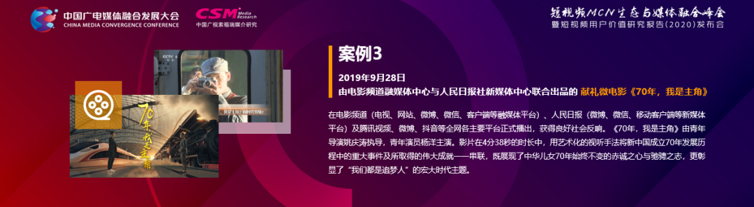 第三,去年我们在国庆前夕由电影频道融媒体中心、人民日报新媒体中心联合出品的“献礼微电影”《70年,我是主角》,在电影频道(电视、网站、微博、微信、客户端等融媒体平台)、人民日报(微博、微信、移动客户端等新媒体平台)及腾讯视频、微博、抖音等全网各主要平台正式播出,获得了比较好的社会反响。《70年,我是主角》是由我们频道签约的青年导演姚庆涛执导的,青年演员杨洋主演,影片在4分38秒的时长里,用艺术化的视听手法将新中国成立70年的发展历程重大的事件串联起来,既展现了中华儿女70年来始终不变的赤忱之心和驰骋之志,更彰显了我们都是追梦人的一个时代主题。