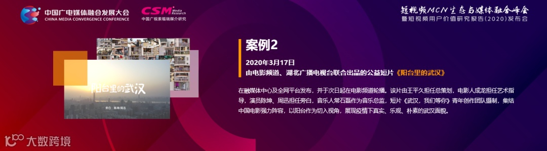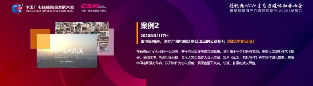 作为电影频道融媒体,在短视频方面,我们新闻内容力求小视频、大主题,就像电影频道和湖北广播电视台联合打造的公益短片《阳台里的武汉》,下面我列举出新闻内容的三个案例: