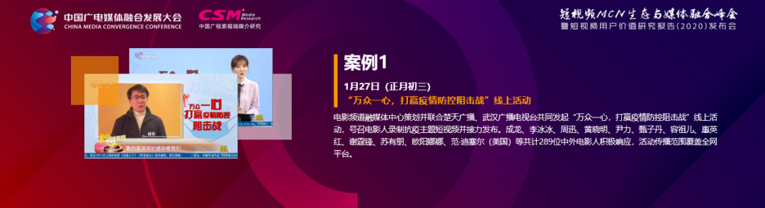 第一,我们在1月27日正月初三,封城以后的第四天,电影频道融媒体中心策划并联合了湖北的楚天广播、武汉广播电视台,共同发起了“万众一心,打击疫情防控阻击战”的线上活动,号召电影人,包括成龙、李冰冰、周迅、黄晓明、尹莉(音)、甄子丹、容祖儿、惠英红,也包含了范迪塞尔等一些国外电影明星一起一共239位电影人,积极响应,共同发起了这样一个线上活动,活动的覆盖范围是我们全平台、全网。