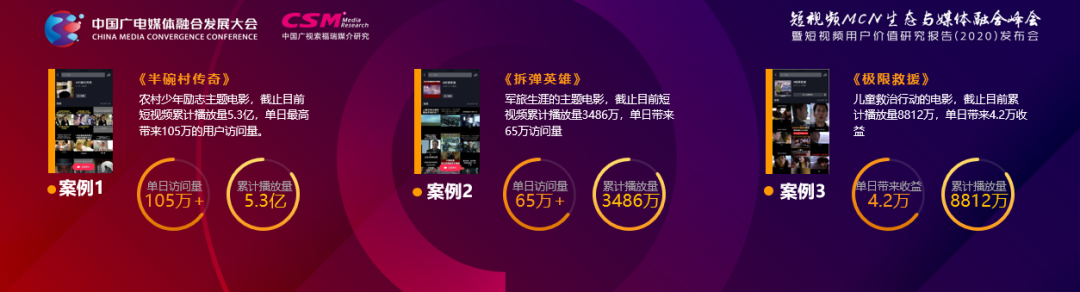 我们特意让同事找出来的这三个案例实际是非典型性的案例,因为在7300多部影片中,我们有很多的大片,这三部,无论是从片名还是内容看,包括它的类型看,其实它并不是被关注类型的影片,两部是儿童影片,一部是军旅题材的,这在别的网站和平台上,日常的点击量并不是特别高,但我们通过每天剪辑短视频以及在全网合作的模式,开放接口,由观众通过搜索引擎,通过短视频来导流的方式,我统计了一个数据,像《半碗村传奇》日均播放量/单日最高能达到105万+,通过这个短视频能带来累计播放数量达5.3亿。《拆弹英雄》除了我们在各平台推放短视频以外,更重要的是我们在恰当时期推出了配合电影频道在电影方面的开播,它带来的单日访问量是65万,以及累计的播放量能够实现3486万。