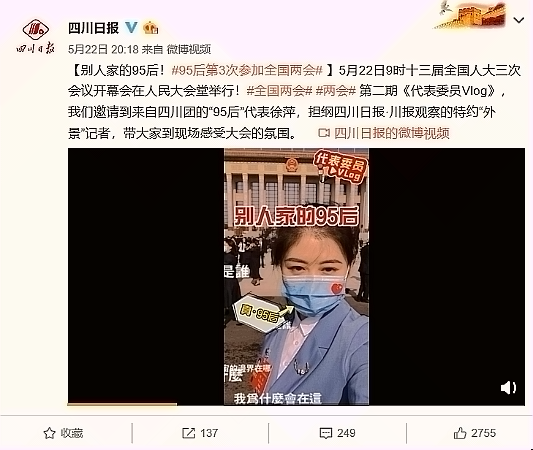 四川日报推出《代表委员Vlog》特别策划,邀请不同领域、不同年龄的代表委员执镜,“95后”代表出镜为其微博账号带来90万的播放量和近期该账号最高互动量(除“王俊凯探秘最高检,Vlog”)。