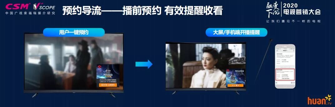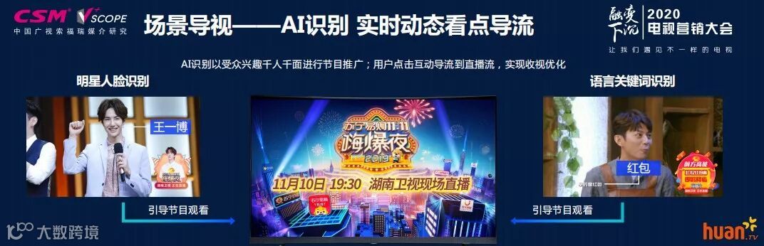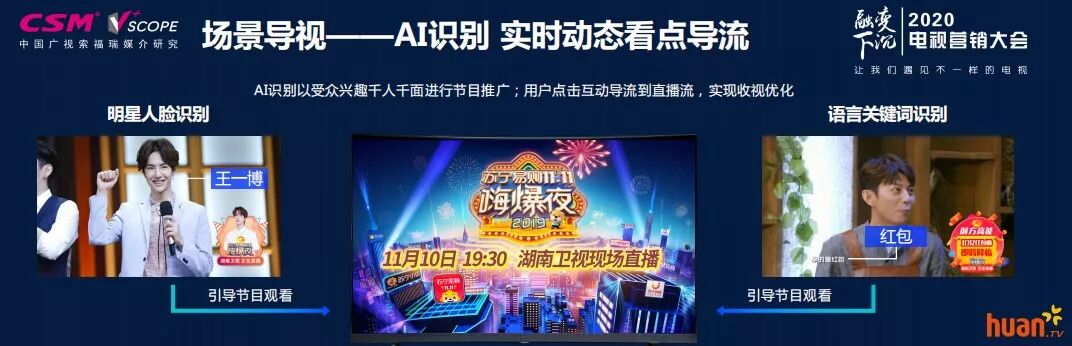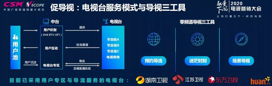 例如做DVB,广电运营商对欢网的最初了解就是做智能导视系统。2011年开始,欢网就以“码农”的身份出现在广电运营商做智能导视系统。这个过程当中我们会推一个零频道,什么是零频道?就是导流三工具,广告四模块。能对用户进行实施识别,不管是直播行为还是点播行为。导视三工具是过去慢慢打磨出来的,帮助湖南卫视和苏宁易购11.11晚会做智能导流。在这个过程当中进行智能电视一系列流量。我现在还记得12月31日晚上我在去恒山的路上面前始终有一个屏显示着数据,就是几个主要客户服务数据变化情况。第一个就是预约导视。