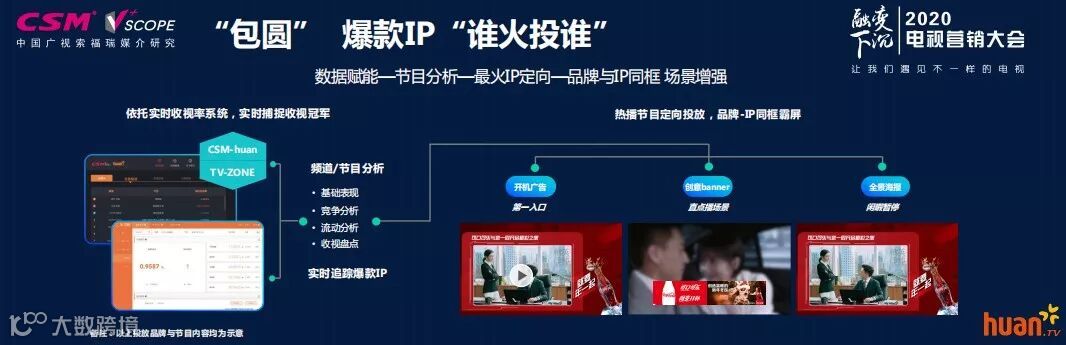 除了收视优化还可以进行一定程度上的广告增量。价值回归大屏核心点,帮助电视台通过既定的IP卖更多的广告。第一,广告主要求在开播前一个礼拜投放;第二,软植一定程度是大餐模式,例如399自助餐,想吃什么吃什么;第三,强调品效合一。在实现的过程中,我们也包含了四个产品。