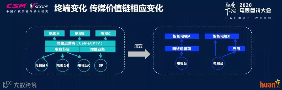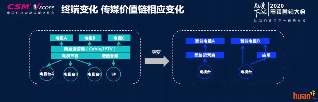 电视行业正在变迁,所谓的变迁是什么呢?这个行业的价值链正在重组。消费管道有的变粗有的变细,从四级架构变成三级。