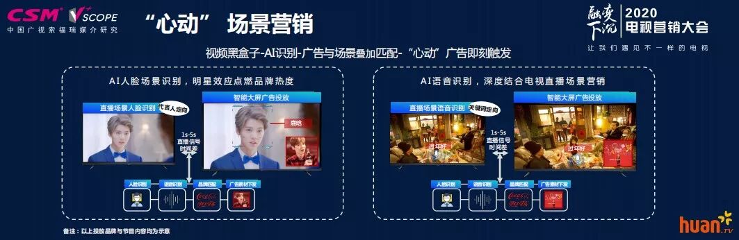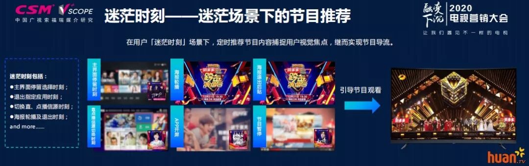 什么东西能达到50%以上的效果呢?我们称之为场景导视。我们跟科大迅飞发布了一个产品叫“场景营销”。它实时捕捉直播画面来给我们弹窗,进行相关画面的捕捉和标签。后来我们把场景营销转变为场景导视,具体是指什么状态呢?在非信源状态下会进行一系列相关的跟踪,这个跟踪是在刚退出某个游戏应用的时候引导受众专场到下一个频道。所以我们实时投放的能力做了场景导视。