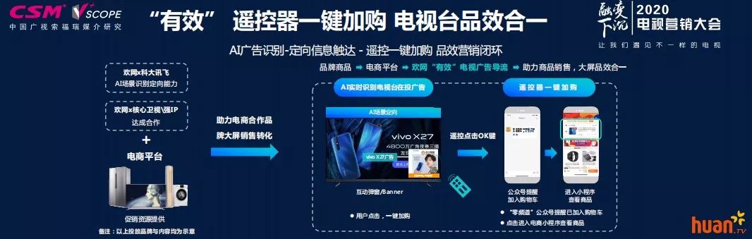 前三个产品是商业化投放,最后一个产品仍在摸索:电视台的硬广能否带货?能不能不通过摇一摇、扫二维码,直接通过摇控器进入京东、苏宁、唯品会的购物车?可以先通过某种方式跟网站进行账号关联,当电视台出现硬广的时候可以带一定品效合一的状态。当用户看到某一广告时,下面有字幕显示唯品会三折,拿起摇控器一点即购,点完之后直接进入购物车。