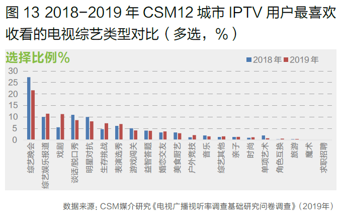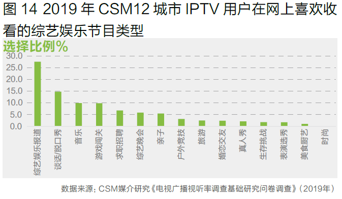IPTV用户收看电视综艺时更喜欢综艺晚会,在网络收看时综艺娱乐报道和娱乐脱口秀位居前列