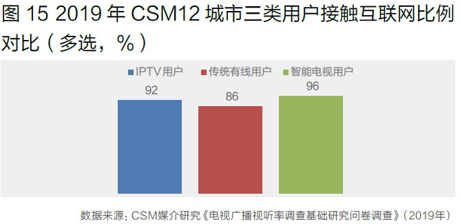 IPTV用户接触互联网的比例达92%,介于传统有线用户和智能电视用户之间