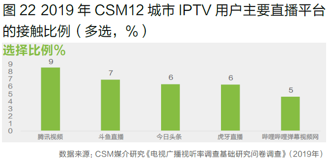 在网络直播平台方面,IPTV用户接触比例总体不及短视频平台,排名最高的前五位分别是腾讯视频、斗鱼直播、今日头条、虎牙直播和哔哩哔哩,其中最高的腾讯视频的接触比例为9%(图22)。在网络直播整体出现退潮时,各主要直播平台的接触比例也同比多有下滑。