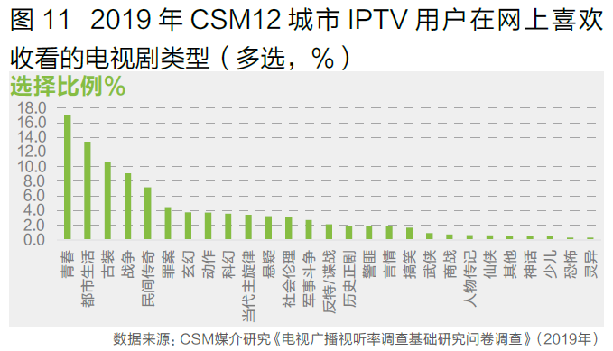 IPTV用户在网上收看视频时最喜欢的电视剧类型排名前五的分别为青春、都市生活、古装、战争和民间传奇类型。视频网站在青春、古装等类型剧目上的相对充分供给,使得青春和古装等电视剧类型在网络收视中偏好明显高于电视直播,选择比例分别达到17.1%和10.7%,位居第一和第三位。