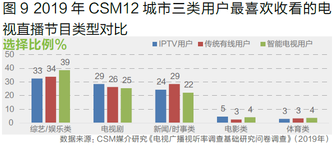 作为驱动电视直播收视的三驾马车,综艺/娱乐类、电视剧和新闻/时事类节目也是IPTV用户最喜欢收看的电视直播节目类型,三者的占比分别为33%、29%和24%。相比而言,传统有线用户对新闻/时事类节目的偏好更高,而智能电视用户则更偏好综艺/娱乐类节目(图9)。