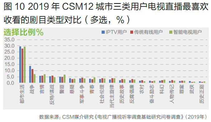 IPTV用户在电视直播收看电视剧时最喜欢的题材前五名分别为都市生活、战争、言情、反特/谍战和警匪类。其中都市生活和战争类的选择比例分别为30%和14%,明显高于其他类型。整体而言,IPTV用户喜欢收看的电视剧类型和传统有线用户比较相似,主要在都市生活和战争类上略高,而智能电视用户则在战争类题材电视剧上偏好明显较低,在警匪、言情和青春类型上略高(图10)。