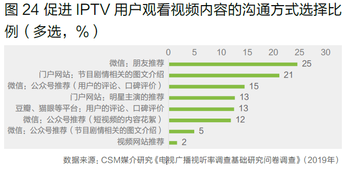 当视频内容通过网络传播与IPTV用户互动时,微信是非常重要的沟通渠道。有87%的IPTV用户在过去半年内使用过微信的朋友圈功能,有22%的用户会在微信朋友圈里对收看过的电视节目(包括电视上和网络上收看到)发表看法,发表看法的比例相比2018年提升5个点。有25%的IPTV用户表示,当看到朋友在微信上的推荐,会促使其观看相关的视频内容,还有15%、12%和5%的IPTV用户表示微信公众号推荐中的用户口碑评价、短视频内容花絮和剧情相关图文内容介绍会促进其视频内容的观看(图24)。