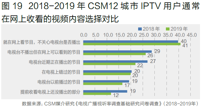 相比2018年,IPTV用户对于“就在网上看节目,不关心电视台是否播出”内容的选择比例有所提升,而“电视台近期正在播出的节目”、“电视台以前播过的节目”和“在电视上错过的节目”三项电视节目内容的比例都有所下滑。网生内容已日益成为IPTV用户收看视频内容更青睐的部分。