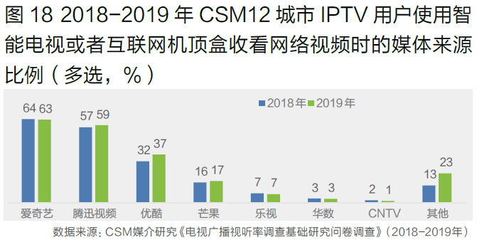 爱奇艺、腾讯视频、优酷及芒果TV是IPTV用户通过智能电视大屏收看网络视频的主要媒体来源