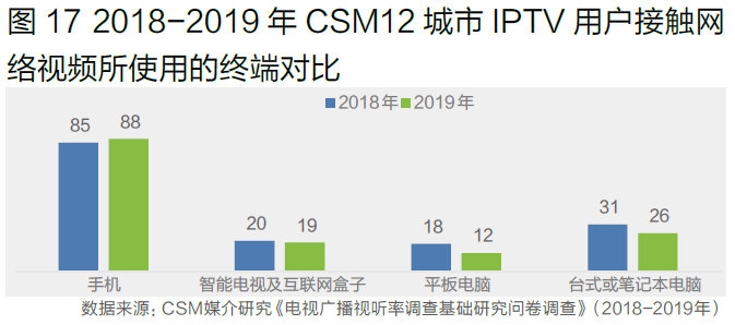 手机是IPTV用户的第一上网终端,平板、台式及笔记本电脑收看网络视频比例有所下滑