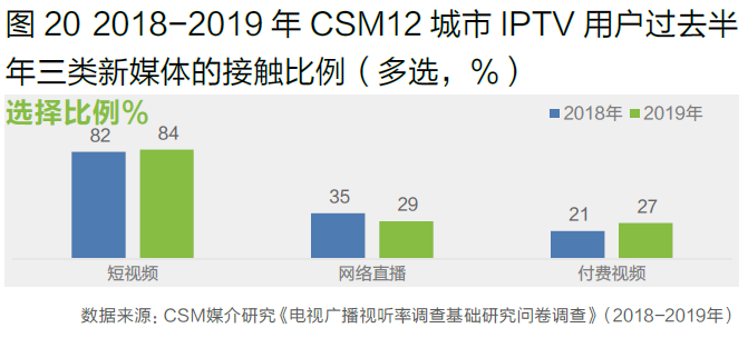 IPTV用户短视频接触比例达84%,付费视频接触比例明显增长,网络直播接触比例出现较大下滑