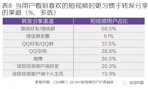 除创作外,社交也是短视频平台促活的重要方式。2019年1月,多闪、马桶MT、聊天宝三款短视频社交软件同时上线。2019年5月,微视上线可直接同步30秒视频至朋友圈功能,短视频社交领域竞争激烈。然而,在短视频客户端,当用户看到喜欢的内容,接近90%的用户将短视频分享至微信,50%的用户分享至QQ群,超过三分之一的用户分享至微博。短视频客户端尚未形成用户间成熟的社交互动闭环,平台社交价值未充分释放。