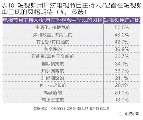 另外,节目主持人/记者是电视媒体入场短视频的重要资源。仅38.2%短视频用户不同程度地表示对短视频中出现的主持人/记者感兴趣,借助名人效应提升电视媒体的传播力仍有待探索。网感、风格人设是电视主持人/记者短视频的加分项。短视频用户最期待亲民的、率真的、有思想有内涵的主持人形象。
