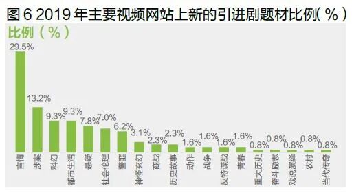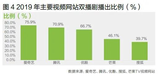 2019年主要视频网站上新的双播剧,视频网站多采用共同播出的方式。在2家及以上视频网站播出的双播剧数量占比为78.7%,采用独播模式的双播剧仅占21.3%。在采用独播方式的双播剧中,优酷上新剧目占比最高,其次为爱奇艺,腾讯占比最低。这也一定程度的反映出,视频网站抢占双播剧的网络独播权是一种成本和收益的权衡,毕竟双播剧的播出收益会与电视台共享。从各视频网站的上新双播剧比例来看,爱奇艺领跑,腾讯、优酷跟随其后,芒果、搜狐与前三家相比有着明显的差距(图4)。