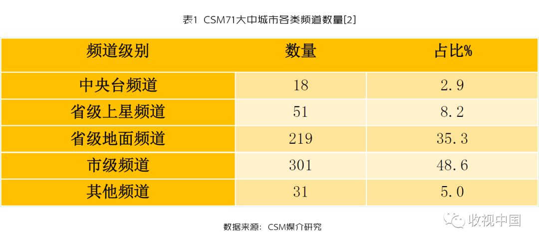 我国地面频道数量众多,在CSM71大中城市中(表1),中央台频道数量最少,只有18个,占比不足3%;省级上星频道共计51个,占比8.2%。地面频道总数量超过500个,占比接近总频道数的85%,是各类频道中数量最多、占比最大的频道类型。其中市级频道数量最多,数量超过300个,占比接近一半,是数量最多的单一频道组;省级地面频道紧随其后,数量超过200个,占比达到35%。