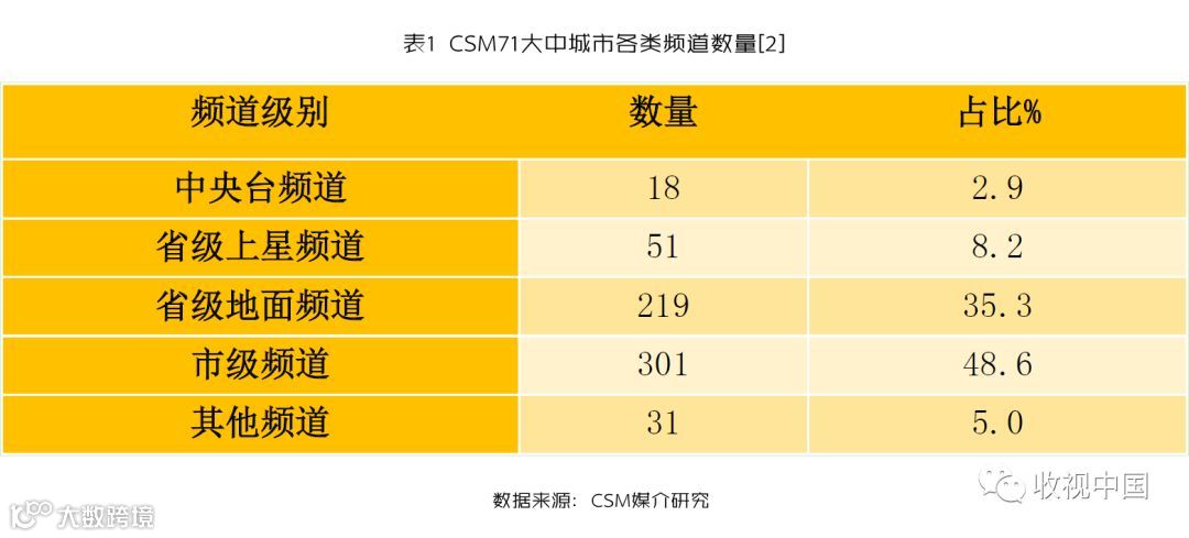 地面频道数量众多,但是却无法形成竞争合力。虽然在总量上看,地面频道拥有绝对优势,由于其覆盖范围有限,具体到某一城市(某一省)竞争时,地面频道总数量仅有10-14个左右,而同时与其竞争的频道有中央台18个、省级卫视51个,如果再加上其他频道,地面频道的占比仅在10%左右,在竞争中数量的优势显然是不存在的,上星频道数量反而是占据绝对优势的。同时地面频道不仅要与上星频道竞争,还面临省级地面频道的竞争,竞争环境最为复杂。