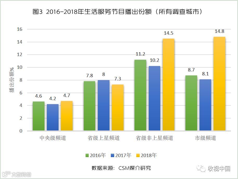 在节目播出市场,近年来地面频道生活服务节目播出份额不断增加(图3),成为地面频道创新突破口。数据表明,中央级频道和省级上星频道中生活服务类节目的播出份额明显低于地面频道,2018年省级地面频道和市级频道的生活服务节目播出份额均在15%左右,是省级上星频道播出份额的2倍多,也远超过中央级频道的播出份额。另外,近年上星频道生活服务节目的播出量保持稳定,而地面频道播出量则明显增长,2018年省级地面频道生活服务节目播出份额增长超过40%,城市台增长率更为明显(超过80%),说明2018年地面频道发力生活服务节目,力求通过生活服务节目改善竞争困境。