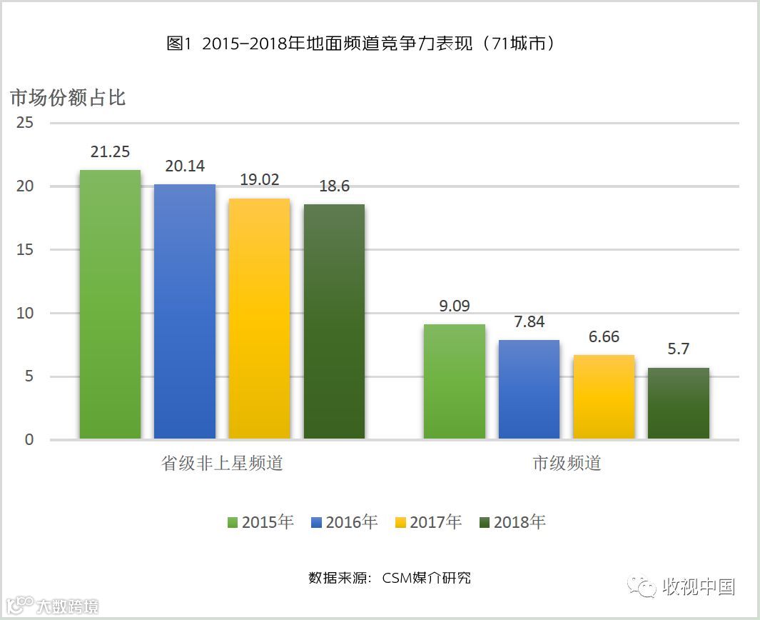 地面频道复杂的竞争环境,各自为战的竞争特质,传导到竞争结果中,体现在竞争数据上,就是市场份额持续下滑。2015年-2018年,无论是省级地面频道还是城市台,竞争力均持续下滑,并且随着智能终端的普及,地面频道的份额呈现出加速下滑的迹象:近年来地面频道累计份额下降超过6个百分点,下降幅度超过20%,其中城市台下降幅度最为明显,下降份额超过3个百分点,下降幅度达到37%,省级地面频道也下降了12%。地面频道在频道竞争中面临困境,亟待找到竞争突破口(图1)。