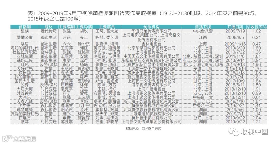 上海这座魔都,既是中国的经济、金融、贸易、航运、科技创新中心,又是我国电影发祥地,加上中西方文化交融,传统与现代气质杂糅,保守与开放碰撞,市井与小资并存,“海纳百川,兼容并蓄”,从而形成了一种与众不同的海派文化,也为海派剧提供了丰厚的素材蓝本与精神给养。1989年充满浓郁上海风格的《上海的早晨》掀开了海派剧的新篇章,2019年具有老上海味道的热播剧《谍战深海之惊蛰》涌动着新海派剧的风尚。浪奔浪流转瞬三十年,海派剧随着时代浪潮一路向前,在不同时代均出现了代表性作品和发展特点。笔者以CSM媒介研究收视数据为基础,梳理了自2007年有播出记录的海派剧,管中窥豹,分析其在题材、代表作、制作公司等方面的播出与收视特征。