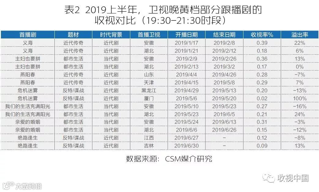 两星联播时代,有些卫视们为了应对巨大的成本压力,在编排方式上灵活多变,力求更高的性价比,采取了“蹭播”的方式,跟播剧(俗称1.5轮,指俩家卫视播剧时间一前一后,后者在前者轮次内开播,通常在首家卫视播出一半集数时插入)重新流行起来。跟播剧在2017上半年播出10部,2018上半年仅2部,2019上半年则回升到7部,包括都市生活、近代传奇、反特/谍战这三类题材。今年上半年在湖北、天津、厦门、吉林这四家卫视中,湖北卫视跟播行为最为积极,跟随安徽卫视接连播出了四部不同风格的首轮剧:《义海》、《主妇也要拼》《我们的生活充满阳光》《亲爱的婚姻》。从收视效果看,跟播剧本身收视率都不太高,但溢出率[1]还不错。“蹭播者”获得的好处并不次于领播者,譬如湖北卫视跟播的《义海》《我们的生活充满阳光》均拉升了频道均值,而后者溢出率甚至大大高于安徽卫视。此外,厦门卫视跟随黑龙江卫视播出的《危机迷雾》,天津卫视跟随山东卫视播出的《燕阳春》,吉林卫视跟随江西卫视播出的《绝路逢生》,溢出率均为正值,也均超越了合作卫视的溢出率,搭顺风车效果极好(表2)。