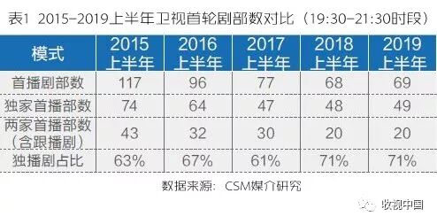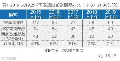 今年上半年卫视晚黄档共播出221部电视剧,首轮剧69部,仅占比1/3 。“一剧两星”政策实施之后,卫视减少新剧播出量的现象早在2016年上半年就已显现。2015上半年卫视开播首轮新剧超过110部,2016上半年低于100部,2017上半年不足80部,2018上半年跌破70部,2019上半年虽然提升了1部,但新剧萎缩基本成为不可逆的大势(表1)。
