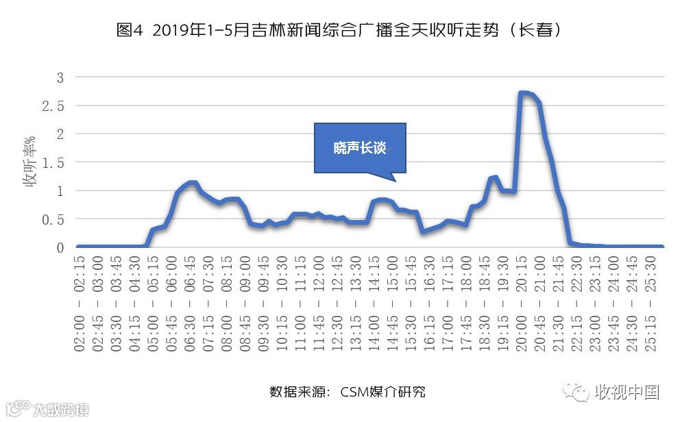 《晓声长谈》是吉林新闻综合广播在2008年7月10日创办的一档情感服务类节目,播出时间为每天19:00-20:30,共计90分钟。可以说《晓声长谈》是情感路途中的一盏明灯,主持人钟晓通过热线电话或者短信等与听众进行心理沟通,一步一步打开当事人的心灵大门。节目关注的核心是“情”:爱情、亲情、友情、人情、真情,重点突出“矛盾”、“心灵”,在关注情的同时,更关注矛盾的化解,心灵的沟通,使这个节目天然具有较强的可听性。因为社会越发展,时代越进步,人们越需要有这样一个平台,无拘无束、无所顾忌地进行情感的宣泄、交流和沟通。2019年长春地区全天收听走势可以看出,《晓声长谈》播出时段形成了一个非常明显的晚间高峰(图4)。