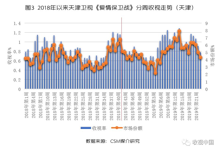 《爱情保卫战》自开播以来,经历了数十次微调和改版,选题领域从原先的情侣扩展到了夫妻,这样一来,让节目增加了一倍的选题量,选题内容也从原先的典型极端逐渐转变成平常百姓家的生活缩影,让观众有代入感。对于一档情感调解类节目而言,情感危机案例如同节目的发动机:房子、工作、两地分居、年龄差距、二婚、父母干涉……越来越多的问题成为年轻人奔向婚姻的绊脚石,而这些问题又直接或间接地反映了当今的社会现实[2]。在节目制作初期,《爱情保卫战》内容表现篇幅更侧重于嘉宾和情感专家,主持人更多是承担访问、控场的职能。从当时节目收视效果来看,观众通过记住情感专家的毒舌点评、矛盾嘉宾的典型故事及双方针锋相对的舞台表现而记住了节目,为节目树立了初期的风格与定位。但随着录制时间的增长及政策的导向引领,节目后来更加侧重于情感专家和主持人的分析点评,以发挥生活服务和情感服务的功能,逐渐找到了内容真实性与形式戏剧性的平衡,并固定下来。可以说,真实是《爱情保卫战》的根本,也是它的一大收视看点。节目中的情侣所面临的问题,正是广大受众所面临的,亦或是正在受众身边上演着的。这档节目在天津本地拥有着极好的口碑,作为一档近十年的王牌节目,即使在媒体竞争环境激烈的今天,依旧保持着旺盛的生命力,从近两年的收视走势可以看出,节目始终保持着较高的收视,且2019年普遍高于2018年水平(图3)。