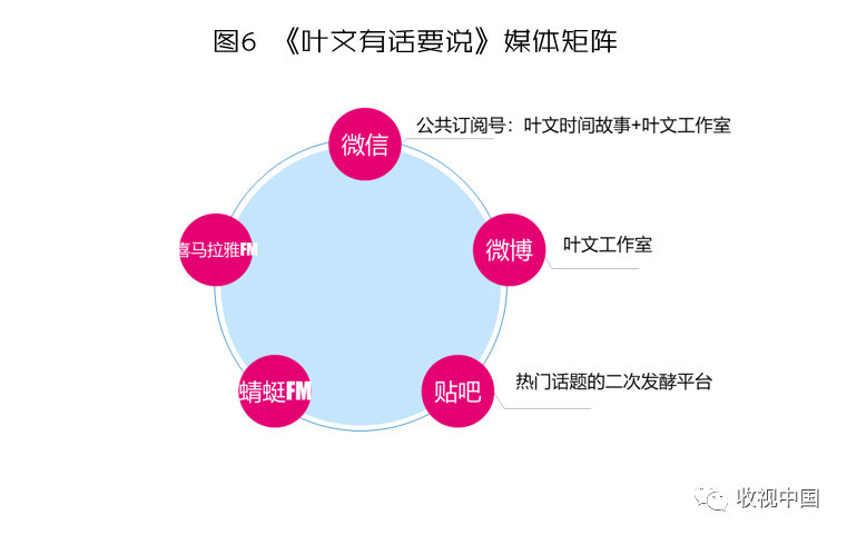 提起广播情感类节目,让人首先想起的便是黑龙江都市女性广播《叶文有话要说》,一个曾经创造了当地收听近25%神话的节目。这是一档典型的私密话题类情感广播节目,听众打进情感热线来诉说自己的情感问题,主持人叶文化身听众心目中的情感专家提出解决问题的方案,不用于那些循循善诱的温柔开导,《叶文有话要说》采用了一种“向你开炮式”的风格,为节目引来了大量的粉丝,也使得《叶文有话要说》节目品牌得以迅速确立。我们不去讨论节目关于边缘话题和言语打击上的某些争议,单纯从节目与新媒体平台的嫁接上来看,单从喜马拉雅平台上,《叶文有话要说》便开设了“叶文有话要说”、“叶文时间”、“叶文讲故事”和“新大学时代”四个专辑,积累了近37万的粉丝量,同时,每一个音频结束后,背景音都会提示添加微信公众号“叶文时间”,再加之网页、微博、蜻蜓FM等,合力形成了《叶文有话要说》的新媒体矩阵(图6),多维齐下将节目和主持人打造成东北地区乃至全国行业内知名的女性情感节目品牌。