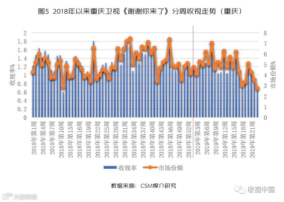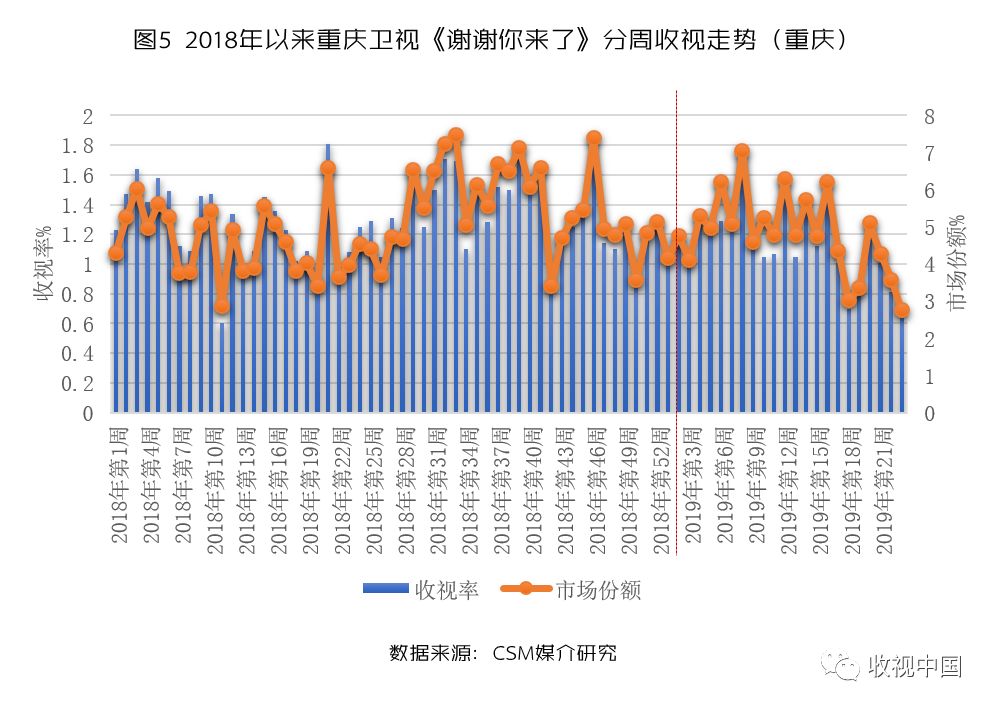 节目自2017年起每周播出,三年来在重庆当地取得了不错的收视成绩,对比近两年的收视与份额走势,节目播出相对稳定,在重庆当地普遍取得高于1%的收视成绩(图5)。