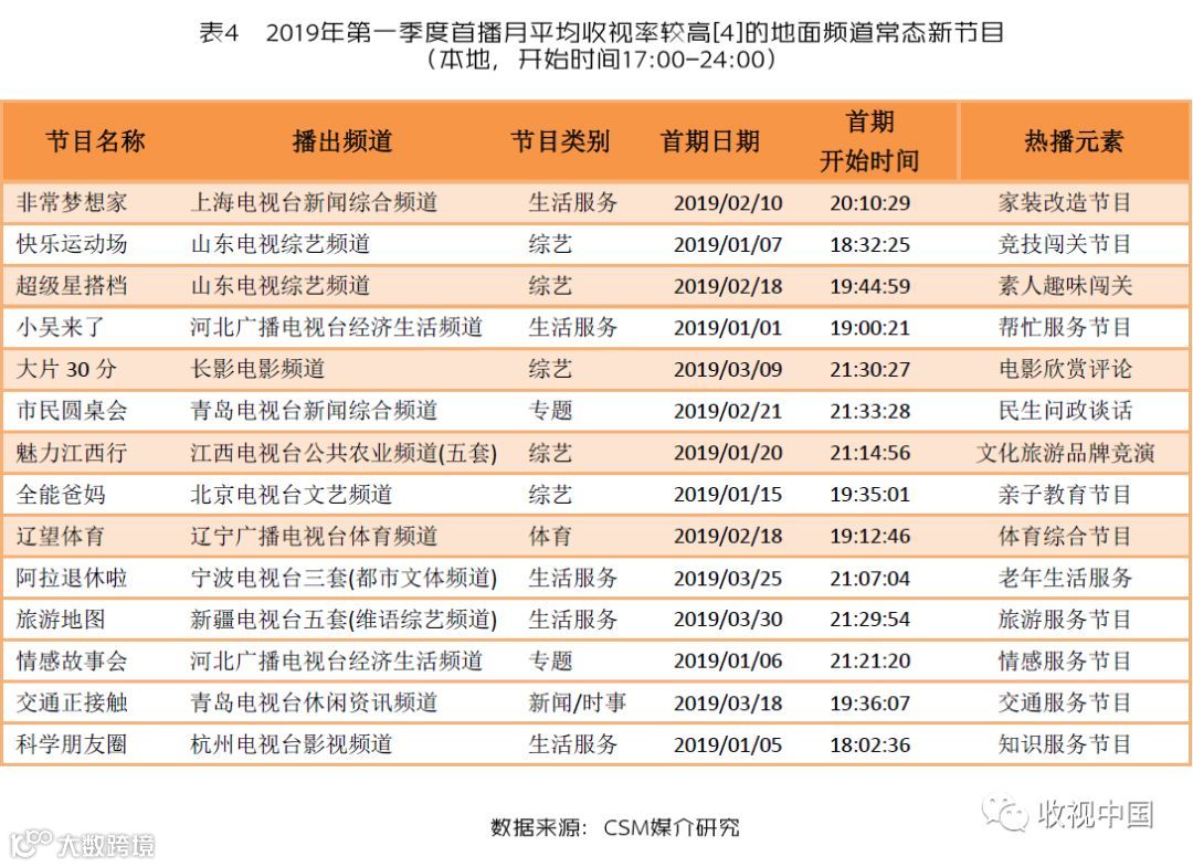 地面频道近年来在节目创新中更加强调贴近、服务和休闲娱乐路线,其收视表现较好的新节目也多是在上述领域有所见长的节目(表4)。2019年第一季度,地面频道首播月本地收视水平较高的常态新节目中,以本地受众喜闻乐见的娱乐休闲为基调和围绕本土民生方方面面展开的服务类节目相对集中,如上海电视台新闻综合频道《非常梦想家》、河北广播电视台经济生活频道《小吴来了》《情感故事会》、青岛电视台新闻综合频道《市民圆桌会》、宁波电视台三套《阿拉退休啦》、新疆电视台五套《旅游地图》、青岛电视台休闲资讯频道《交通正接触》和杭州电视台影视频道《科学朋友圈》分别从家装改造、帮忙、民生问政、情感、老年生活、旅游、交通和知识服务等角度,全方位关注大众的衣食住行乃至于情感生活的方方面面;娱乐类节目中,山东电视综艺频道《快乐运动场》《超级星搭档》、长影电影频道的《大片30分》、江西电视台公共农业频道的《魅力江西行》、北京电视台文艺频道的《全能爸妈》等节目,则以本土休闲娱乐为基调,以竞技互动等为形式,极大地丰富了区域受众的娱乐生活。