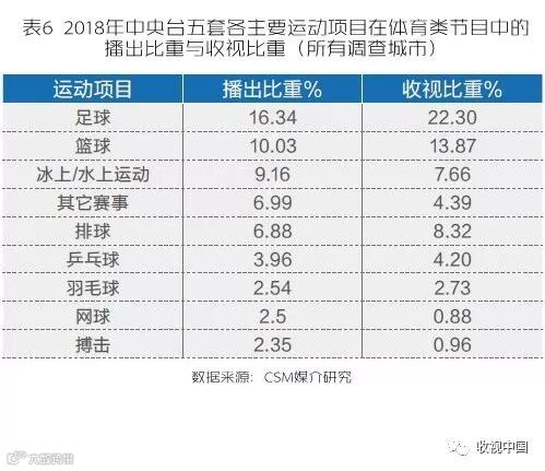 两大传统球类乒乓球、排球在2018年依然保持着广泛的群众基础,尽管节目播出比重并不高,但收视比重相对较高,排球项目的收视比重较2017年有所增长。