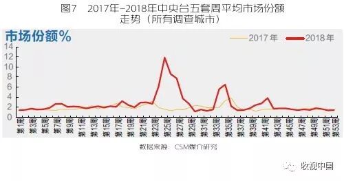 对比2018与2017年全年中央台五套市场份额走势,我们可以很清晰地看出大型赛事对中央台五套市场份额的拉动作用。在没有大型赛事举办的时期,2017和2018两年的市场份额并没有体现出明显的差距,但在大型赛事,尤其是6月进行的俄罗斯世界杯和8月进行的雅加达亚运会期间,中央台五套的市场份额远高于2017年同期,大型赛事的播出对电视市场收视份额的影响可见一斑(图7)。