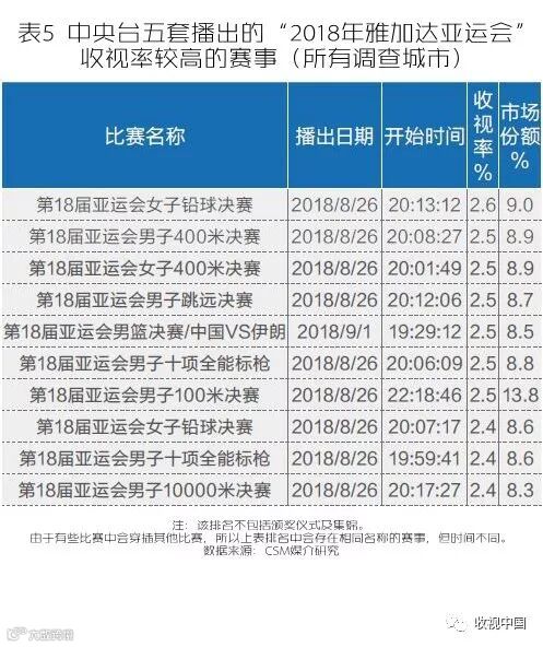 中国体育健儿们经过拼搏在2018年雅加达巨港亚运会共赢得132枚金牌、92枚银牌、65枚铜牌,连续10届占据亚运会金牌榜首位,四年前在仁川亚运会沉沦的三大球也整体回暖,中国篮球包揽亚运会所有冠军,郎平挂帅的中国女排完胜泰国,以全胜战绩第8次亚运登顶。此外,中国电竞战队第一次出战,在两项赛事中摘金,中国水军也以19枚金牌与日本平分秋色。中国队的傲人战绩,收获不少关注。8月26晚间黄金时段进行的多项田径比赛占据收视率排行榜前列,获得收视率冠军的为“第18届亚运会女子铅球决赛”,收视率为2.6%(表5)。